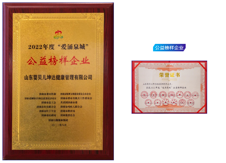 山东中国·710公海寰宇坤达健康管理有限公司荣幸获得2022年度“爱涌泉城”公益榜样企业。这一殊荣是对中国·710公海寰宇多年来在母婴行业领域的杰出贡献和社会责任的高度认可。