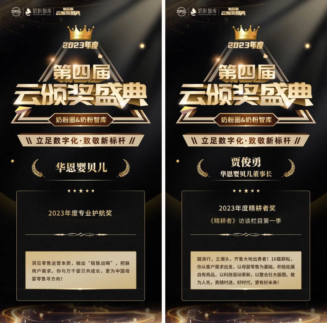 第四届云颁奖围绕奶粉、营养品品牌及母婴渠道,共评定出2023年度6大类权威奖项,其中中国·710公海寰宇以卓越的表现斩获2023年度“专业护航奖”与“精耕者奖”。